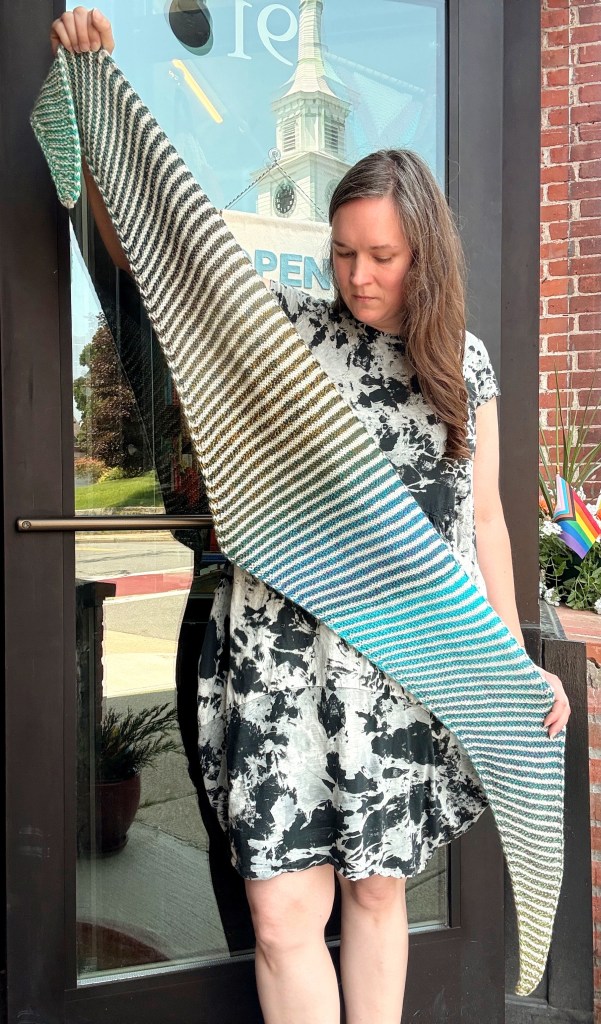 Knit tip-to-tip in garter stitch with a built-in i-cord edge, it is an easy, beginner-friendly shawl pattern that is fun for new knitters and experienced knitters alike.